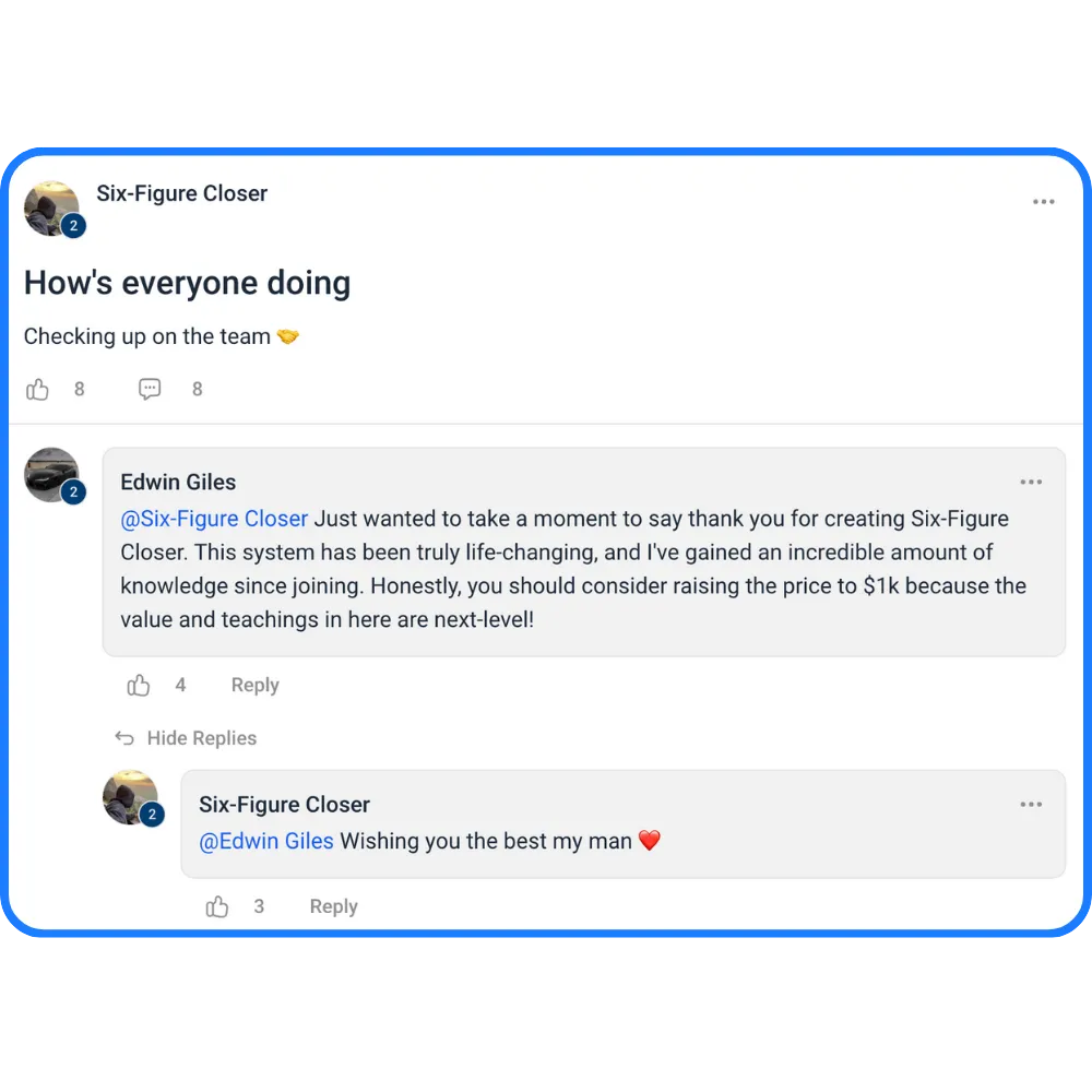 If you're serious about becoming a Six-Figure Closer but have a few questions before joining, our team is ready to help.